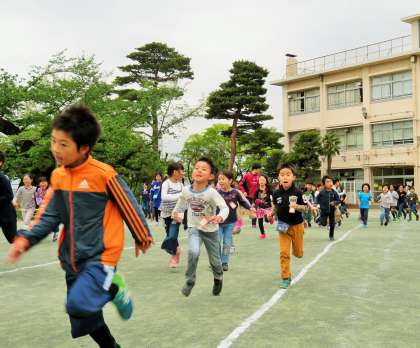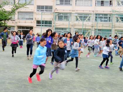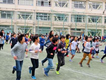 砧小学校では、始業前の朝遊び・朝ランニングに毎日取り組んでいます。軽快な音楽が流れると、それに合わせてリズムよく走っています。朝遊び・朝ランニングをすることで、脳が活性化され、授業での集中力もアップします。