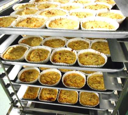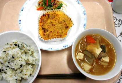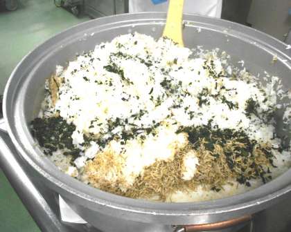 今日の給食の主菜は、<切干大根の卵焼き>です。砧小では、1回に約550個の鶏卵を使い、卵焼きを作ります。給食で、鶏卵を扱う時には、ひとつずつ割り、中身の安全性を確認してから調理に使用します。