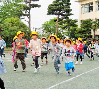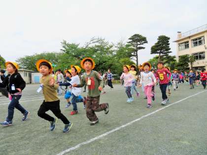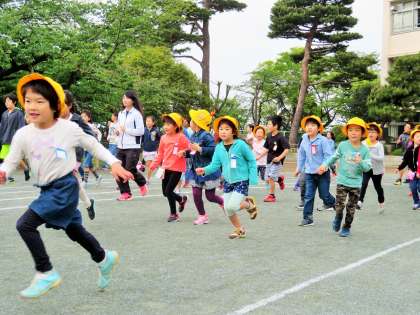 今日は1年生が、朝遊び・朝ランニングにデビューです。今年度の重点目標の一つである「健康・体力づくり」への取り組みですが、朝ランニングの曲が流れると、朝遊びをやめて、音楽に合わせて楽しそうに走っていました。