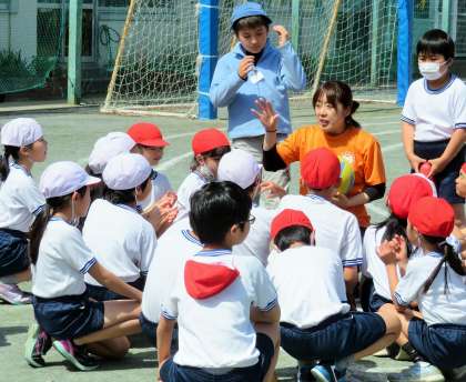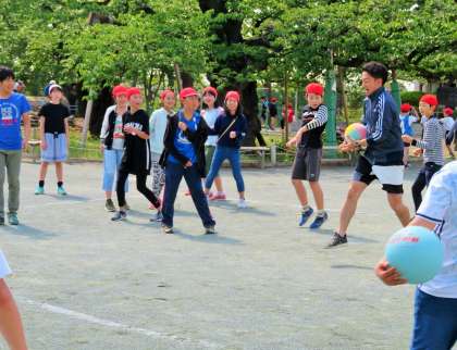 写真は、ドッジボールをしている6年生、4年生の様子です。