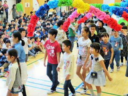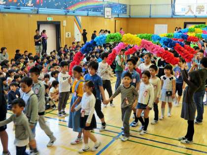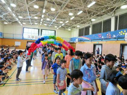 今日は1年生を迎える会です。まずは1年生と6年生が手をつないでの入場です。1年生は上級生の子どもたちの人数の多さに、少し緊張した面持ちでした。それをほぐそうとする6年生のやさしさが印象的でした!