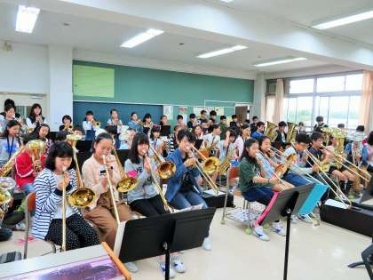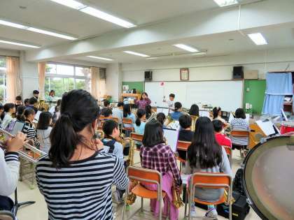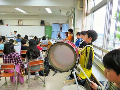 今朝から6年生鼓笛の朝練習は、メジャーと金管楽器、打楽器と合わせて演奏しています。音楽の遠藤先生と担任の先生のご指導のもと、音がだんだんと揃ってきています。