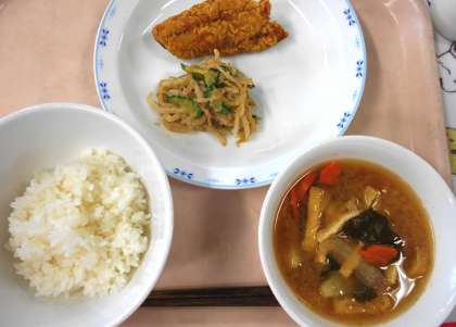 今日の主菜は、<魚のカレー揚げ>です。今日は、さばを使いました。カレー粉の香りが食欲をそそるカレー揚げです。魚が苦手な子も、積極的に食べていたので安心しました。教室をまわっていると、「いつもおいしい給食をありがとうございます!」と嬉しい言葉のシャワーをかけてもらいました。