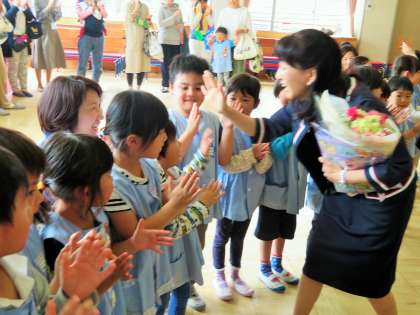 子どもたちからは、感謝の気持ちを込めた歌、そして最後は園歌が遊戯室に響き渡りました。寂しくも、温かい離任式でした。