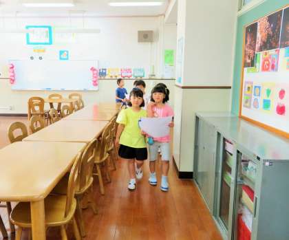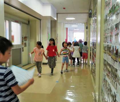 今日は2年生が、お兄さん、お姉さんとなり、1年生を学校探検(学校案内)に連れて歩きました。1年生と手をつないで、校長室、職員室、主事室、図書室、ランチルームなど、校舎案内図を手にしながら、それぞれの場所で案内をしました。