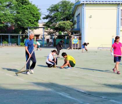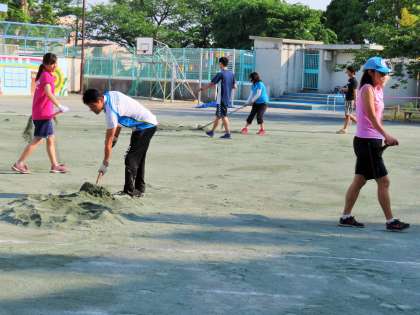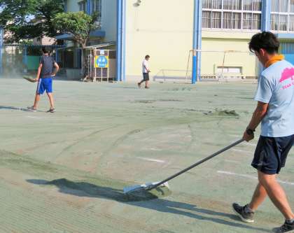 現在、砧小学校の校庭は水はけがよいので、大雨の後でも比較的早く校庭遊びができます。この状態を維持するために、校庭を大切に使ったり、メンテナンスもまめにしたりします。