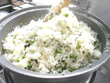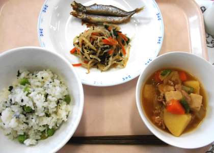 今日の主食は、<わかめ入りグリンピースご飯>です。1年生の子どもたちが旬の食材グリンピースのさやむきをし、給食作りのお手伝いをしてくれました。2年生から6年生も、「1年生がさやむきをしてくれたから、グリンピースは苦手だけど頑張って食べるよ。」と話し、しっかり食べていました。