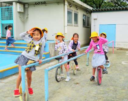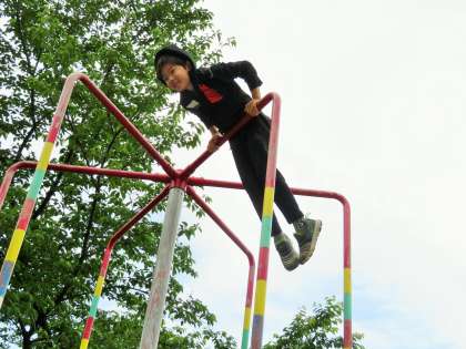砧小学校では、始業前の朝遊び・朝ランニングに毎日取り組んでいます。1年生は、真っ先に校庭に出てきて、一輪車やポンポコ山で遊んでいます。中には、登り棒のてっぺんで遊んでいる子もいます!