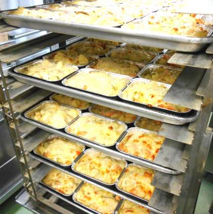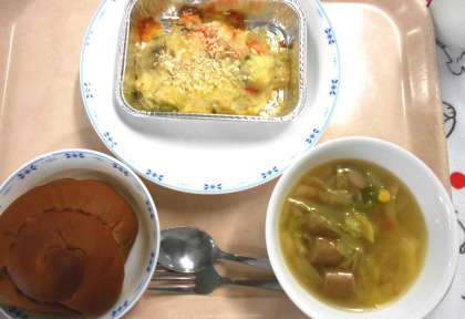 今日の主菜は、<新じゃがとアスパラの米粉グラタン>です。旬の野菜新じゃがとアスパラガスを使い、米粉で作ったルーでもっちりしたグラタンに仕上がりました。サーモンも加えましたが、どの学級もよく食べていました。アルミケースの片付け方がとても美しいクラスもありました。