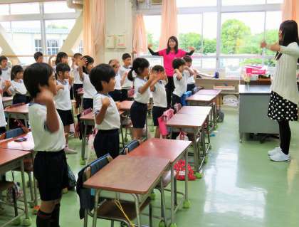 最後は、英語の歌「Seven step」をジェスチャーをしながら歌い、楽しく英語と親しみました。子どもたちは、笑顔で一生懸命がんばっていました!