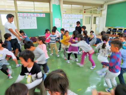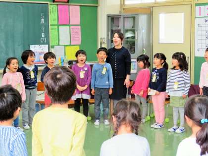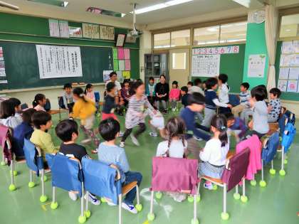 今日は、1年生の学級で「島田先生ありがとうの会」がありました。島田先生は、明日から産休に入ります。まず、島田先生からみんなの成長を褒めていただき、一人一人にメッセージ入りのしおりをいただきました。次に、じゃんけん列車やフルーツバスケットで一緒に遊び、最後に歌のプレゼントで校歌を元気よく歌いました!