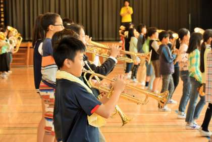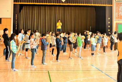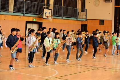 昨日、6年生鼓笛のフォーメーション練習の様子です。初めて楽器をもって、フォーメーションの練習です。「キングスコート」の動き方を練習しました。