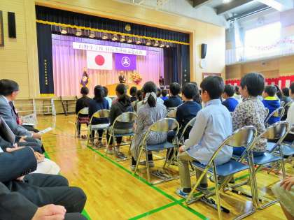 次に、6年生児童による呼びかけと合唱、合奏がありました。子どもたちの態度がとても立派で、合唱や合奏も一生懸命で感動しました。