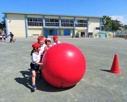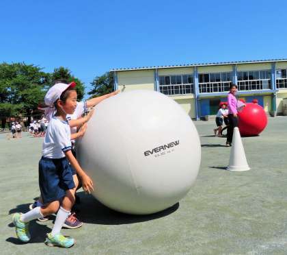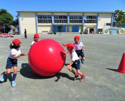 2年生の団体競技は「大玉ころがし」です。4人がグループになって、自分より大きな大玉を協力して運びます。笑顔で最後までがんばりました。本番がますます楽しみになりました!