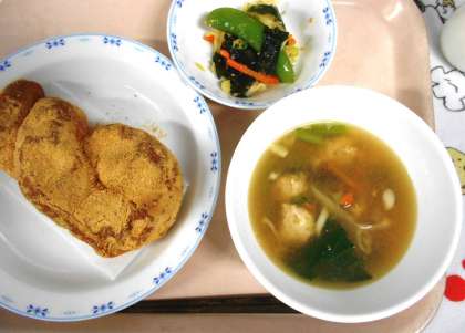 今日の給食は、人気の<きなこあげパン>です。献立表を配布した時から、あげパンの日をチェックしている子も多かったようです。