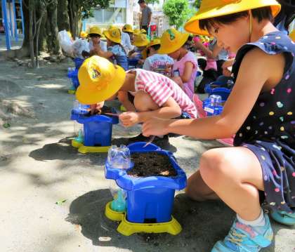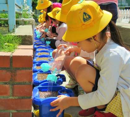 6粒ずつ種をまきました。芽が出てくる日が楽しみです。これから毎日、水やりのお世話をしながら、草花を大切にする心を育てていきます。