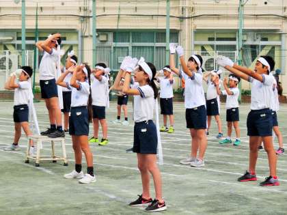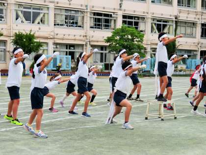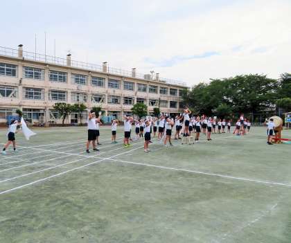 応援団の朝練習は校庭デビューです。応援団は運動会を盛り上げる花形です。そのために、繰り返し練習を励み、心と技を高めています。