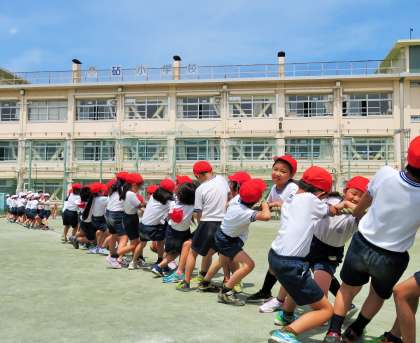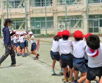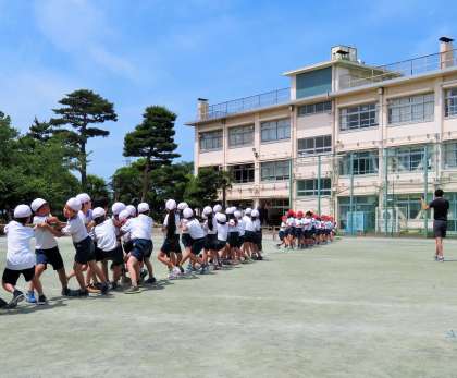 3年生の団体競技は「綱引き」です。「オーエス!」「オーエス!」の掛け声に合わせて、一生懸命に力を合わせます。大きな声を出して綱を引くこと、空を見て引くこと(斜め上を見れば、自然に体軸が後傾になり体重を利用しながら引ける)ことをポイントに力いっぱい引っ張っています。