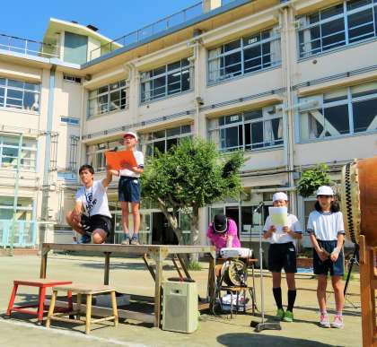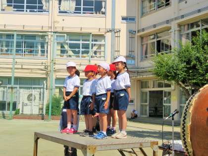 児童代表のことば(1年生)、スローガン発表の様子です。