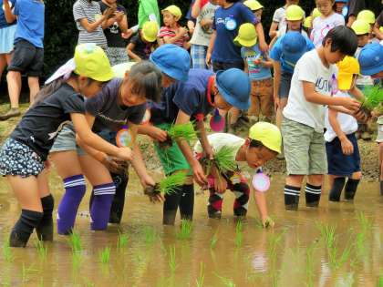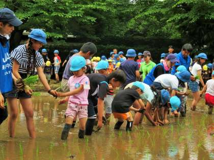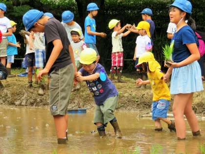 今日は5年生が、砧幼稚園年長星組さんとの交流の一環で、次大夫堀公園に田植えに行って来ました。先日の「はじめましての会」で仲良くなった、5年生と星組さんがペアになり、協力して田植えを楽しみました。