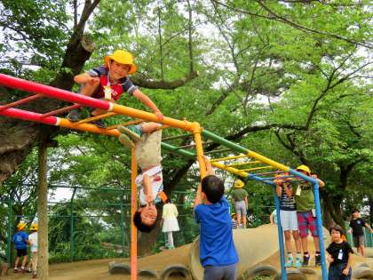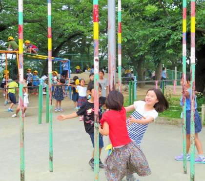 運動会が終わりホッと一息の朝遊びの様子です。鬼ごっこやボール、うんてい、鉄棒、一輪車、竹馬などで遊んでいる子が多くいます。私も鬼ごっこに誘われ、いつもの鬼役で一緒に遊び、息が上がってしまいました!
