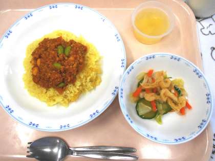 今日の給食は、<豆入りドライカレー>です。「今日はカレーだ。嬉しい。」と展示食をみて、ガッツポーズをして喜んでいる姿もありました。大豆と枝豆を加えましたが、どの学級もとてもよく食べていました。