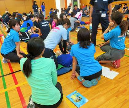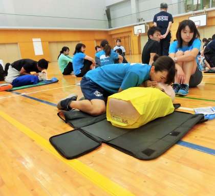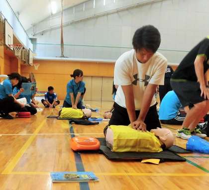 昨日、今年度の水泳指導に向けて、救命救急講習会を喜多見小学校と砧南小学校と3校合同で行いました。成城消防署の方々に来ていただき、心肺蘇生法、AEDの使い方を中心に、応急手当の方法を、実習を通して学びました。