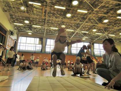 今日は3年生と4年生のスポーツテストです。測定種目は「反復横跳び」「立ち幅跳び」「長座体前屈」「上体起こし」「ソフトボール投げ」「20メートルシャトルラン」「握力」「50メートル走」の8種目です。今日は4種目を実施しました。