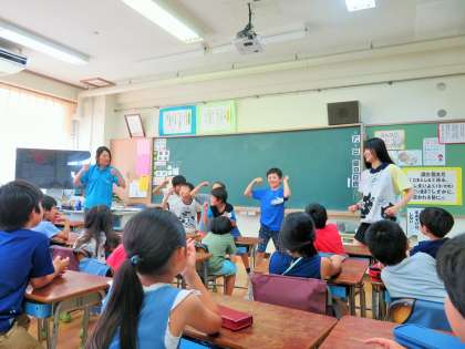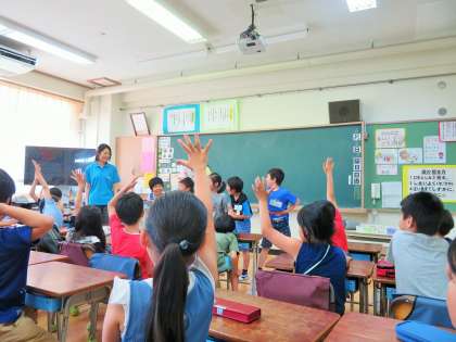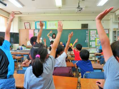 ミッシェル先生と担任の先生との授業ですが、「嬉しい」「悲しい」「いいね」などの気持ちを表す言葉をジェスチャーを使いながら表現しました。クイズなども交えて、楽しく英語と親しみました。