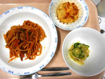 今日の給食の主食は、<スパゲッティナポリタン>です。ナポリタンは、イタリアのナポリという町のスパゲッティをまねて、日本で作られた料理です。