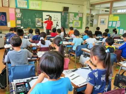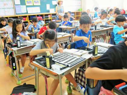 3年生は習字の学習が始まっています。今日はまず、道具の準備の仕方や筆の持ち方の確認をしました。鉛筆とは違って、筆を立てて持つことが難しかったようです。