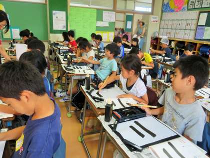 その後、始筆、送筆、終筆に気を付けながら「二」を書きました。半紙を前にして真剣に取り組む子どもたちの姿がありました。作品ができあがり満足げな表情が見られました。