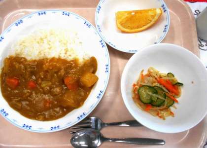 今日の給食は、子どもたちに人気の<チキンカレーライス>です。「今日は、朝からカレー粉のいい香りがしていました。給食の時間が楽しみです。」と話している子もいました。