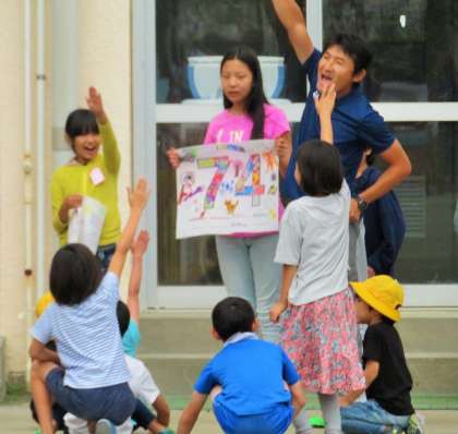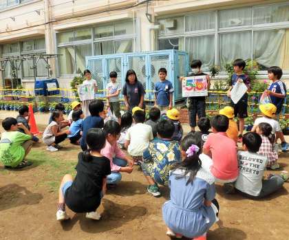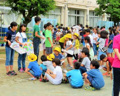 先日の昼休みは、縦割りの班で、6年生91人がすべて班長となる『なかよし班活動』の第3回目です。それぞれの班の待ち合わせ場所に、集合する時間が少し早くなってきました。班ごとに作成した旗が目印になっています。