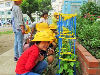 朝会終了後、1年生は育てている朝顔の観察をして、その成長にニッコリです!