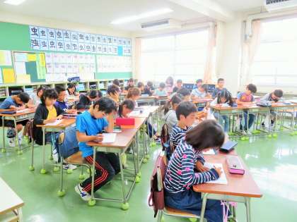 今朝は本格的な雨の中の登校でしたが、教室を回ると、子どもたちは漢字ドリルや計算プリントに向かい、静かに集中して朝学習に取り組んでいました。思わず、姿勢の良さを褒めてしまいました。5・6年生は、英語のモジュール授業です。