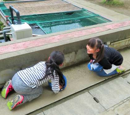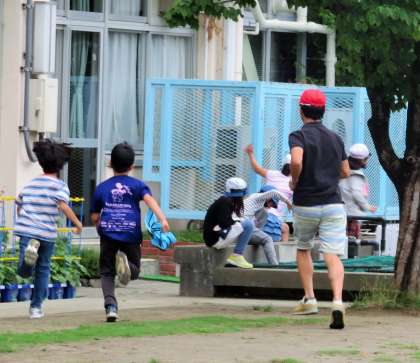 写真は、鬼ごっこを楽しんでいる5年生と4年生の様子です。校長室前の鯉の池は、絶好の隠れ家になっています。