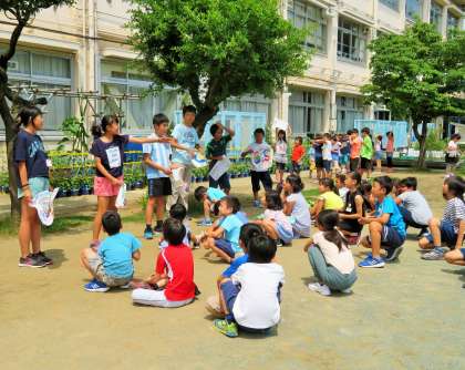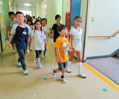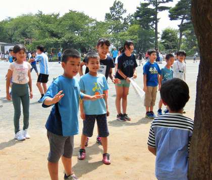 昨日の昼休みは、縦割りの班で、6年生91人がすべて班長となる『なかよし班活動』です。まずは4年生が1年生のお迎えです。それぞれの班の待ち合わせ場所に、集合する時間が早くなってきました。班ごとに作成した旗が目印になっています。集合が完了した班から遊びのスタートです!