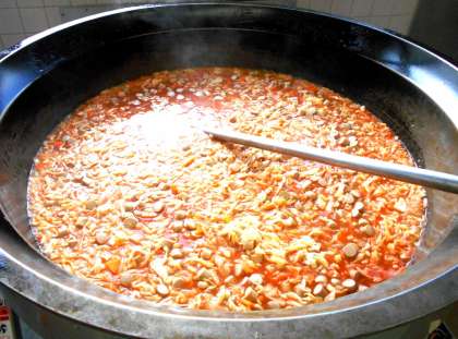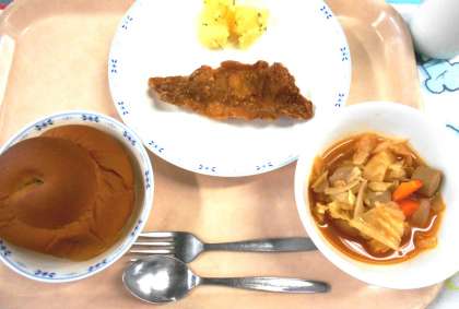 今日の給食は、明日のワールドカップの試合で日本が対戦する国ポーランドの料理です。今日のスープ<ビゴス>は、ポーランドの有名な家庭料理です。ポーランドでは、きゃべつの酢漬けを使って作りますが、給食では酢をかくし味に使い、仕上げました。
