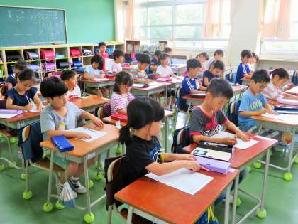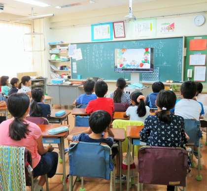 5・6年生は、英語のモジュール学習で、担任の先生と一緒に、映像を見ながら楽しそうにアルファベットを発音していました。