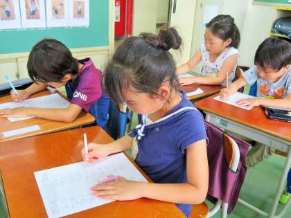 今年度砧小学校では、基礎学力の定着に向けて、始業前の朝学習に週3回取り組んでいます。子どもたちは漢字ドリルや計算プリントに向かい、静かに集中して取り組んでいました。