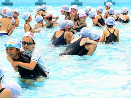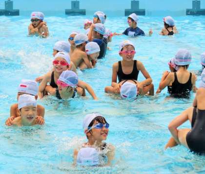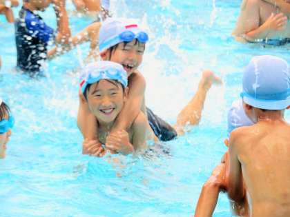 今日は水慣れが中心です。夏休みの水泳教室も含めて、各自の目標を達成してほしいと願っています。
