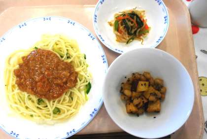 今日の給食は、<ジャージャー麺>です。<ジャージャー麺>は、中国の家庭料理で、肉みそをめんの上にかけていただきます。どの学級も、もりもり食べていました。