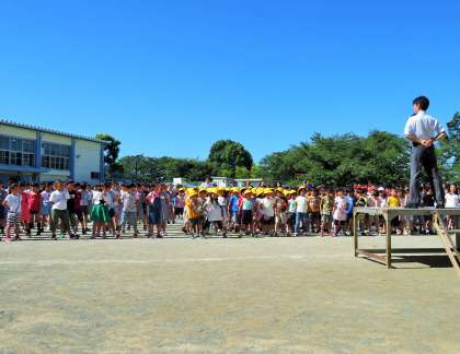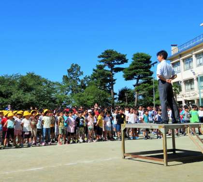今日の全校朝会では、6年2組体育「ソフトバレーボール」の研究授業の話をしました。