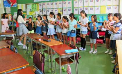 先日、3・4年生の英語活動がありました。ミッシェル先生と担任の先生との授業ですが、子どもたちの楽しそうなこと・・・。