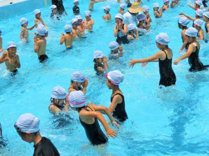 今日は、水と仲良くなることがめあてです。夏休みの水泳教室も含めて、各自のめあてを達成してほしいと思っています。
