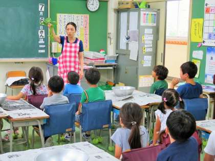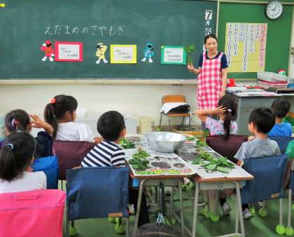 今日は1年生が、生活科の時間に枝豆のさやもぎをしました。今日の給食に出る枝豆、全校児童分です。まずは、栄養士の先生から枝豆のもぎ方や栄養についての話がありました。
