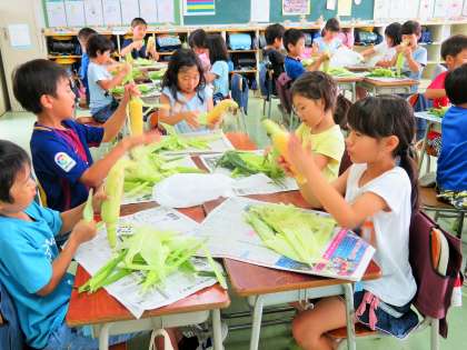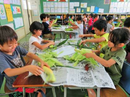 子どもたちはどんどん皮をむいています。とってもみずみずしいとうもろこしです!