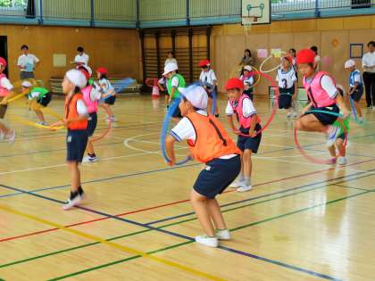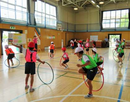 村田先生の動きをよく見て、フラフープを回す、転がす、跳ぶなどの動きを振り返りました。