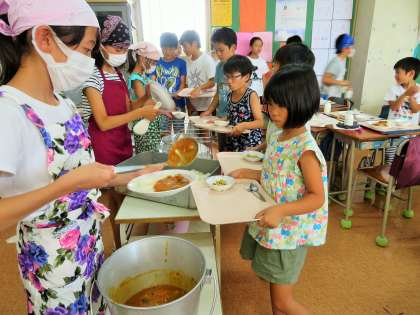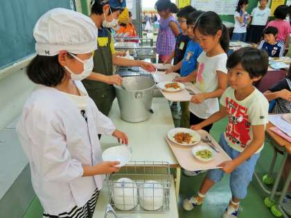 まずは「交流給食」です。配膳は5年生が、1年生のお迎えは4年生が行いました。